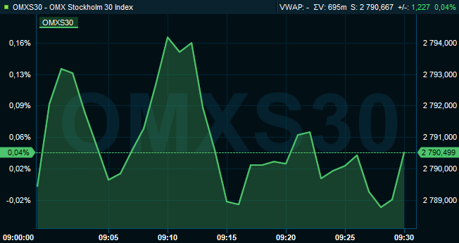 Omkring klockan 9.30 var storbolagsindexet OMXS30 oförändrat till 2.790. Aktier för cirka 1,2 miljarder kronor hade då omsatts på Stockholmsbörsen i sin helhet.
