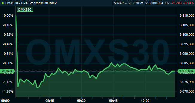 Efter en dryg halvtimmes handel hade storbolagsindexet OMXS30 minskat med 0,9 procent till nivån 3.080. Aktier för 2,9 miljarder hade då omsatts på Stockholmsbörsen i sin helhet.