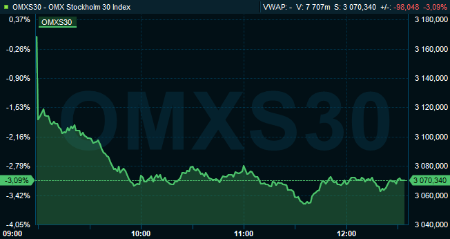 Vid 12.30-tiden var storbolagsindexet OMXS30 ned 3,1 procent till nivån 3.070. Aktier för totalt 12 miljarder kronor hade då omsatts på Stockholmsbörsen i sin helhet. Utvecklingen var i linje med de ledande Europabörserna.