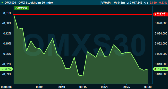 Klockan 9.30 var det svenska storbolagsindexet OMXS30 ned 0,4 procent till nivån 3.017. Aktieaffärer för närmare 1,6 miljarder kronor gjordes under de första 30 handelsminuterna.