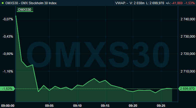 Strax innan klockan 09.30 på fredagen var OMXS30 ned 1,5 procent till 2.698. Aktier för nära 2,8 miljarder kronor var då omsatta på Stockholmsbörsen i sin helhet. Ute på de ledande Europabörserna var index i London ned 1,5 procent medan Parisbörsen var ned en bit över 1 procent.