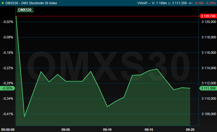 Omkring klockan 9.20 hade storbolagsindexet OMXS30 sjunkit 0,3 procent till 3.111. Aktier för 1,7 miljarder kronor var då omsatta på Stockholmsbörsen.