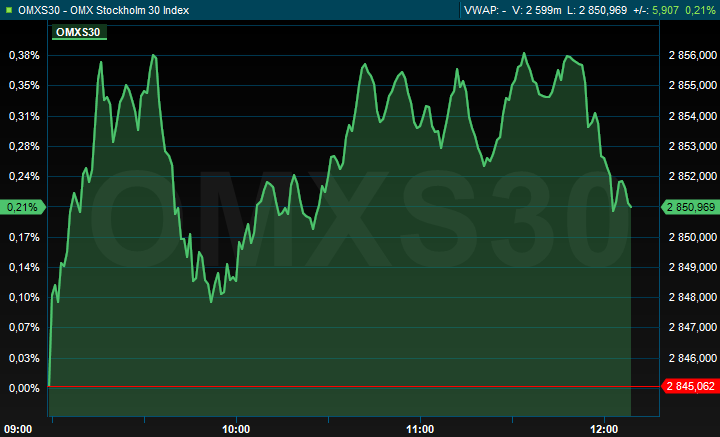 Omkring klockan 12.10 var OMXS30 upp med 0,2 procent till 2.851.