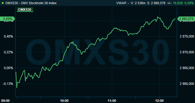 Omkring klockan 12.15 hade OMXS30 stigit 0,6 procent till 2.880 och aktier för 3,7 miljarder kronor hade hunnit omsattas på Stockholmsbörsen denna årets sista handelsdag.