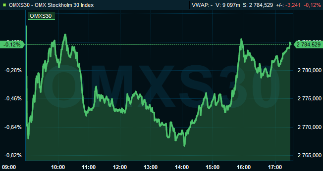 Vid börsens stängning hade storbolagsindexet OMXS30 backat 0,1 procent till nivån 2.785. Då hade aktier för 15 miljarder kronor bytt ägare på Stockholmsbörsen.