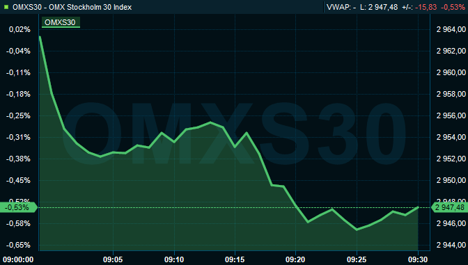 Storbolagsindexet OMXS30 var efter en knapp halvtimme ned 0,5 procent till nivån 2.947. Aktier för 1,9 miljarder kronor hade då omsatts på Stockholmsbörsen i sin helhet.