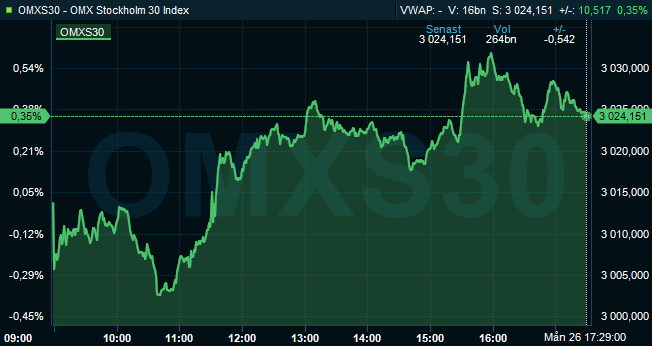 Storbolagsindexet OMXS30 steg 0,4 procent till nivån 3.024. Vid stängning hade aktier för 23 miljarder omsatts på Stockholmsbörsen.