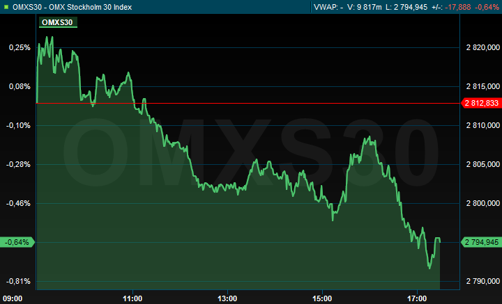 Vid stängning hade det svenska storbolagsindexet OMXS30 handlats ned 0,6 procent till nivån 2.795. Aktier för omkring 17 miljarder kronor hade då omsatts på Stockholmsbörsen i sin helhet.