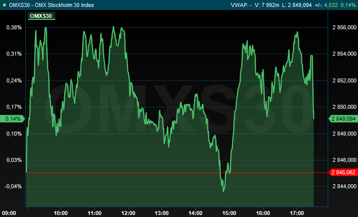 Vid stängning hade OMXS30 stigit med 0,1 procent till 2.849. Aktier för 12 miljarder kronor hade då omsatts på Stockholmsbörsen i sin helhet.