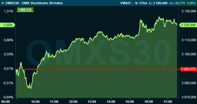 Breda OMXSPI handlades upp 1,0 procent medan storbolagsindexet OMXS30 steg 1,0 procent till nivån 3.120. Vid stängning hade aktier för 26 miljarder omsatts på Stockholmsbörsen.