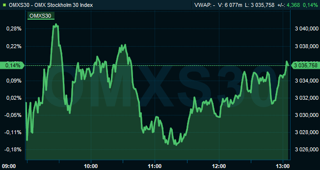 Runt klockan 13:00 hade det svenska storbolagsindexet OMXS30 stigit 0,1 procent till nivån 3.036. Aktier för 9,8 miljarder kronor hade då handlats på Stockholmsbörsen.