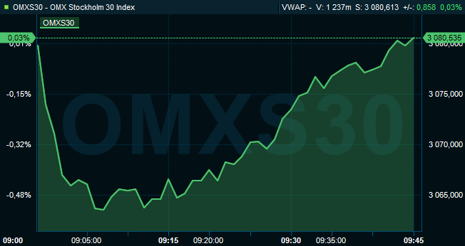 STOCKHOLM (Nyhetsbyrån Direkt) Efter en rapporttät morgon öppnade Stockholmsbörsen på minus. Klockan 09.45 hade nedgången dämpats och storbolagsindexet OMXS30 handlades sidledes till nivån 3.081. Då hade 2.962 miljarder omsatts på Stockholmsbörsen i sin helhet.