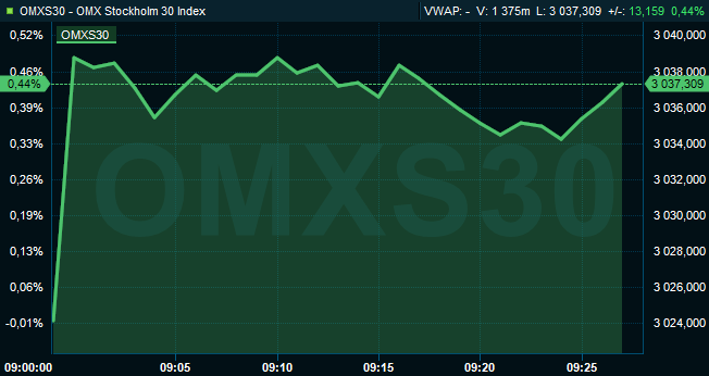 Klockan 09.25 var det svenska storbolagsindexet OMXS30 upp 0,4 procent till nivån 3.037. Aktieaffärer för 2,1 miljarder kronor hade då gjorts på Stockholmsbörsen. Ledande Europabörser rörde sig i samma riktning.