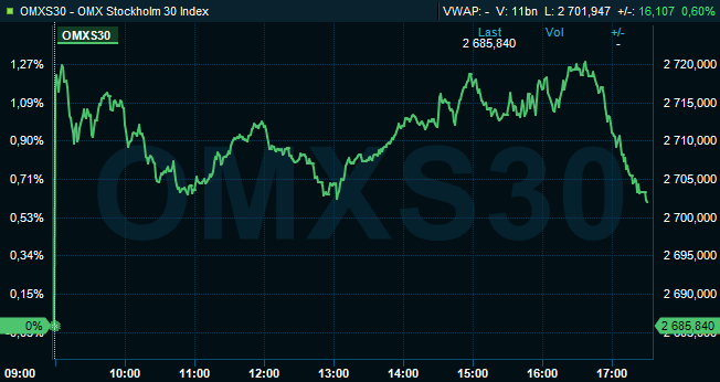 Vid stängning hade OMXS30 stigit 0,6 procent till 2.702 och aktier för 17 miljarder kronor omsattes på Stockholmsbörsen.