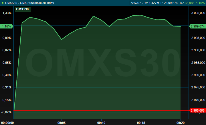 Vid klockan 9.20 hade storbolagsindexet OMXS30 stigit 1,2 procent till 2.999. Aktier för 2,0 miljarder kronor hade då omsatts på Stockholmsbörsen i sin helhet.