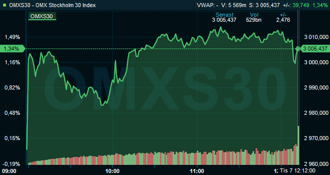 Vid klockan 12.30 hade storbolagsindexet OMXS30 stigit 1,3 procent till nivån 3.005. Aktier för 7,9 miljarder kronor hade då omsatts på Stockholmsbörsen i sin helhet.
