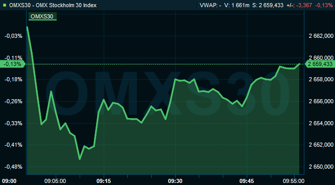 Vid 10-tiden hade OMXS30 backat med 0,1 procent till 2.659. Aktier för 3 miljarder kronor var då omsatta på Stockholmsbörsen i sin helhet. Ute på de ledande Europabörserna noterades en blandad utveckling där index i London var upp knappt en halv procent medan Frankfurtbörsen visade en försiktig nedgång.