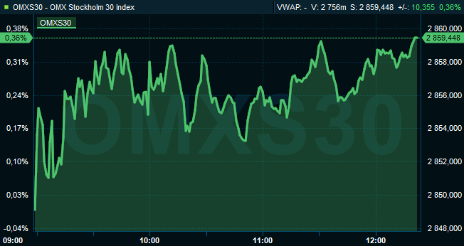 Vid klockan 12.20 var det svenska storbolagsindexet OMXS30 upp 0,4 procent till nivån 2.859. Aktier för drygt 4 miljarder kronor hade då omsatts på Stockholmsbörsen i sin helhet. Ute på de ledande Europabörserna återfanns index runt nollstrecket.