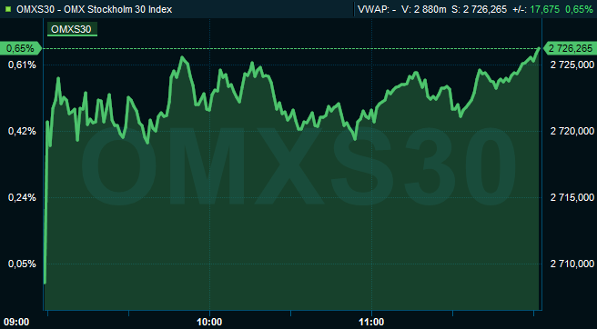 Vid 12-tiden hade OMXS30 stigit 0,7 procent till 2.726. Aktier för 5 miljarder kronor hade då omsatts på Stockholmsbörsen i sin helhet. Ute på de ledande Europabörserna var Londonbörsen upp knappt en procent medan index i Frankfurt var i det närmaste oförändrat.