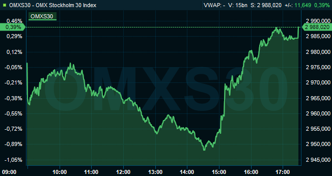 Vid stängning hade det svenska storbolagsindexet OMXS30 stigit 0,3 procent till nivån 2.988. Aktier för 21 miljarder kronor hade då omsatts på Stockholmsbörsen.