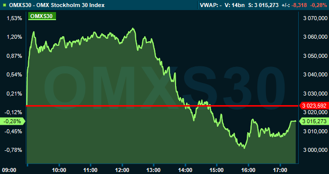 Vid börsens stängning var det svenska storbolagsindexet OMXS30 ned 0,3 procent till 3.015. Aktier för 21 miljarder kronor hade då omsatts på Stockholmsbörsen.