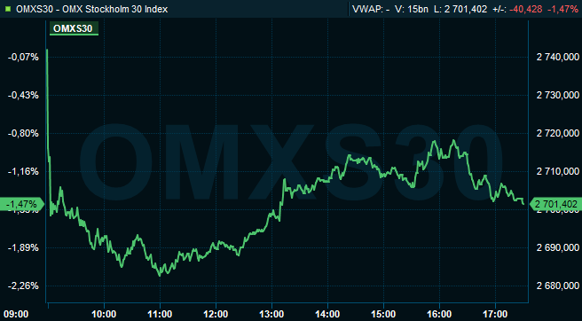 Vid stängning hade OMXS30 sjunkit 1,5 procent till 2.701 och aktier för 21 miljarder kronor omsattes på Stockholmsbörsen.