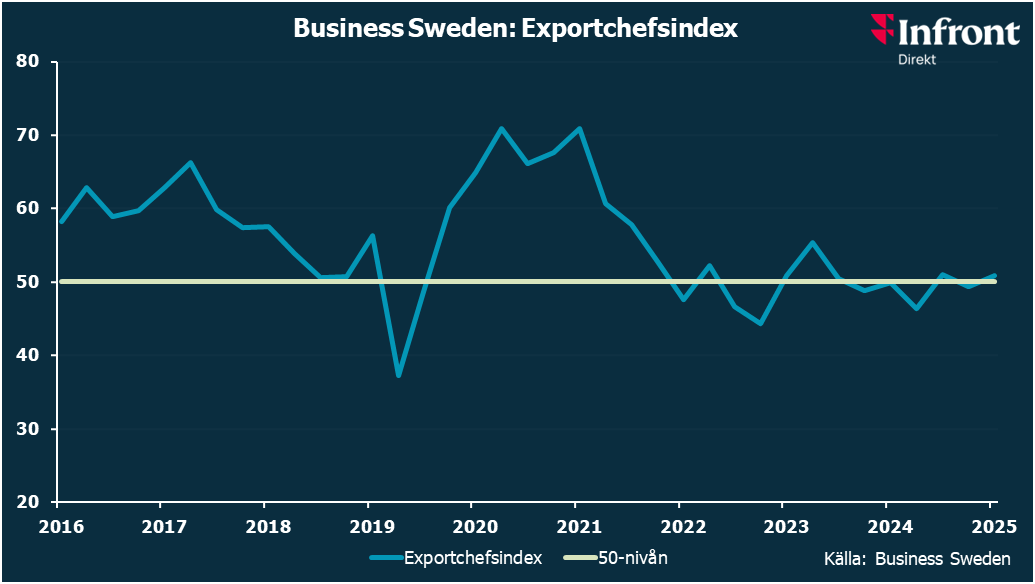 Undersökningen genomförs bland exportansvariga i 225 företag. Ett exportchefsindex över 50 innebär att det är fler som tror på en förstärkning av exporten än en försvagning, och tvärtom.