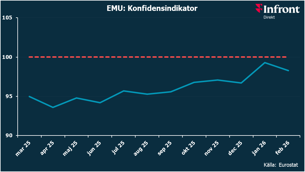 STOCKHOLM (Nyhetsbyrån Direkt) EU:s konjunkturbarometer visar att den samlade konfidensindikatorn, ESI, för euroländerna sjönk till 98,3 i februari, från reviderade 99,3 föregående månad (99,4).