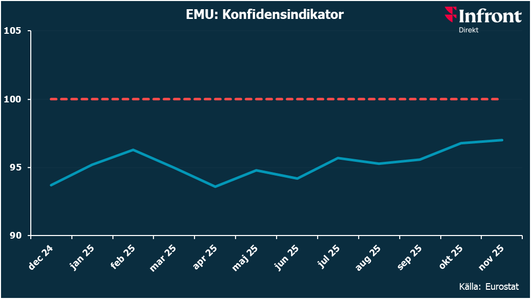 STOCKHOLM (Nyhetsbyrån Direkt) EU:s konjunkturbarometer visar att den samlade konfidensindikatorn, ESI, för euroländerna steg till 97,0 i november, jämfört med 96,8 föregående månad.