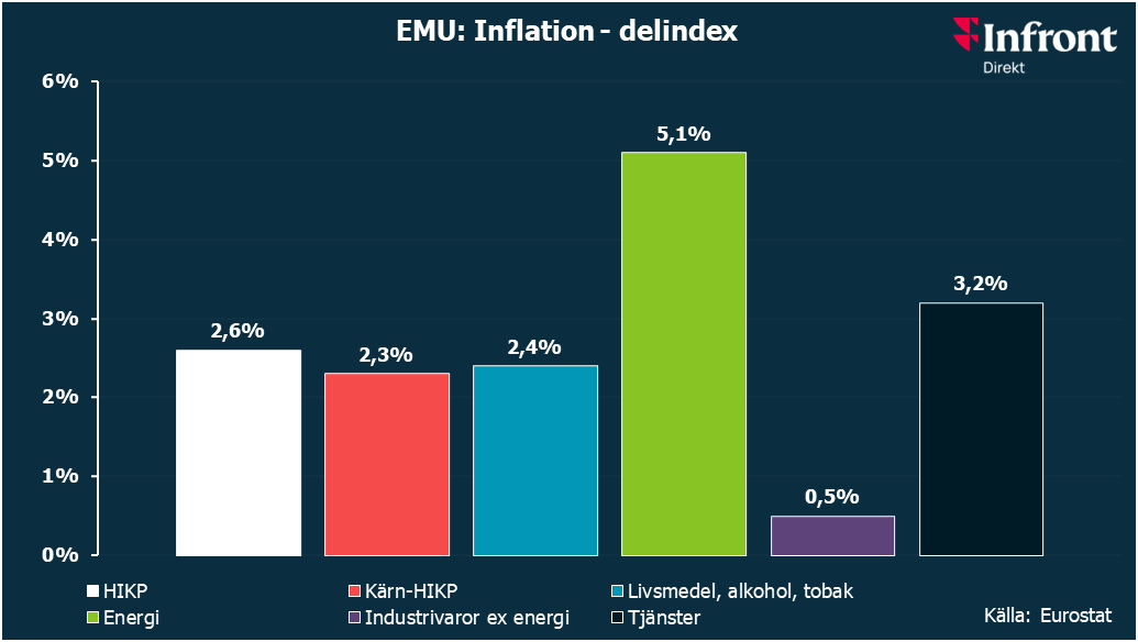 STOCKHOLM (Nyhetsbyrån Direkt) Inflationstakten (HIKP) i euroområdet uppgick till 2,6 procent i mars, upp från 1,9 procent i februari.