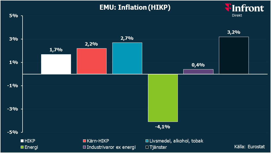 STOCKHOLM (Nyhetsbyrån Direkt) Inflationstakten (HIKP) i euroområdet sjönk till 1,7 procent i januari jämfört med 2,0 procent i december.