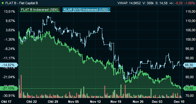 Den 21 november hade Klarna backat till 28:11 dollar medan Flat Capital-aktien kostade 15:48 kronor. Fortfarande en premie mot substansvärdet per aktie, som då var strax över 14 kronor.