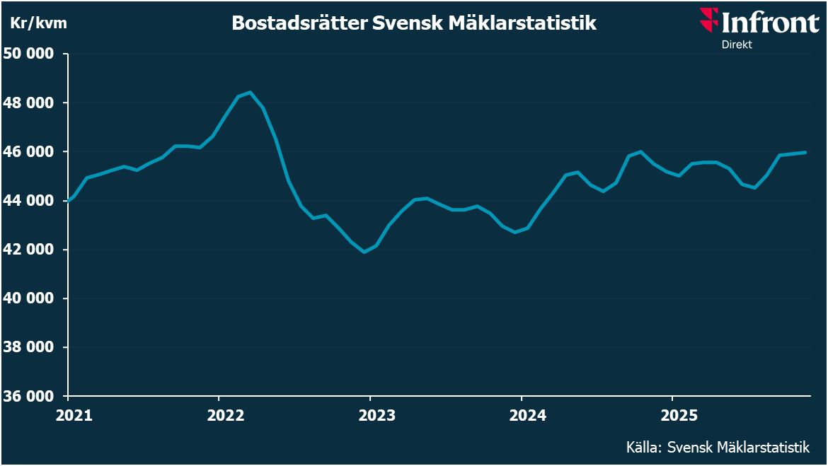STOCKHOLM (Nyhetsbyrån Direkt) Bostadsrättspriserna i Sverige steg 0,1 procent i november jämfört med föregående månad. Villapriserna sjönk 0,8 procent.