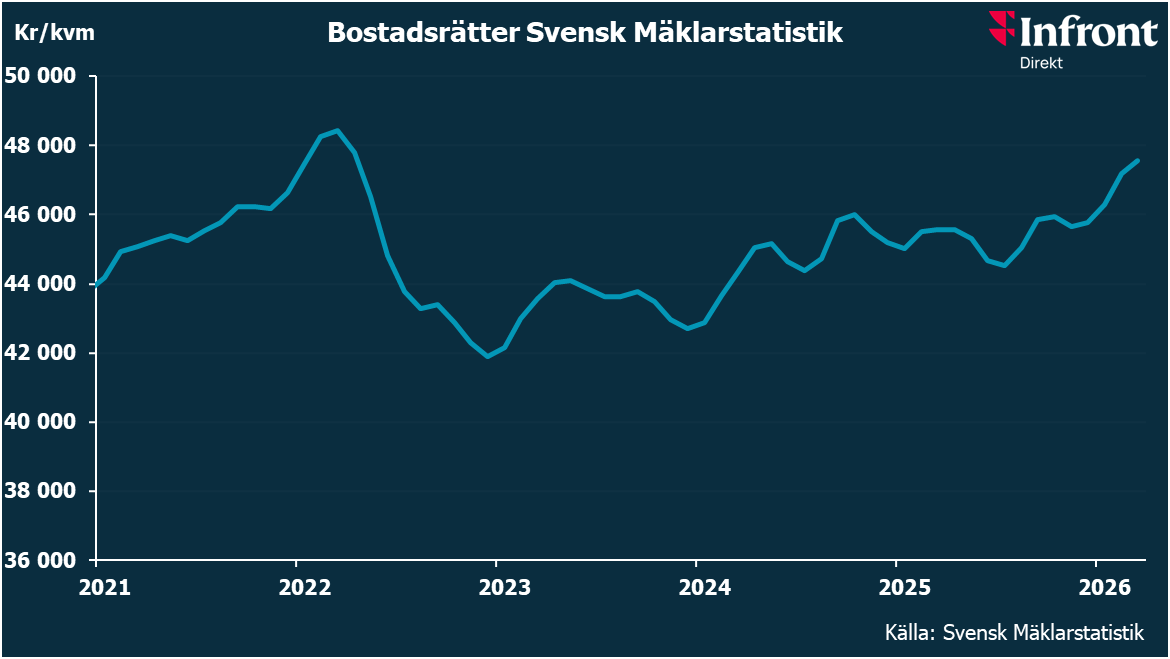 STOCKHOLM (Nyhetsbyrån Direkt) Bostadsrättspriserna i Sverige steg 1,9 procent i mars jämfört med föregående månad. Villapriserna steg 1,0 procent.