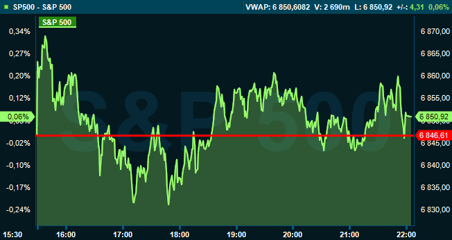 Vid börsstängning var breda S&P 500 upp 0,1 procent till 6.851, och räknat från Stockholmsbörsens stängning hade indexet stigit 0,1 procent. Dow Jones industriindex lyfte 0,7 procent till 48,254, samtidigt som tekniktunga Nasdaq Composite backade med 0,3 procent till 23.406.