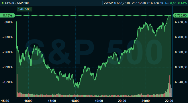 Vid börsstängning var breda S&P 500 upp 0,1 procent till 6.728, och räknat från Stockholmsbörsens stängning hade indexet stigit 1,2 procent. Dow Jones industriindex steg 0,2 procent till 46.987, samtidigt som tekniktunga Nasdaq Composite sjönk med 0,2 procent till 23.004.
