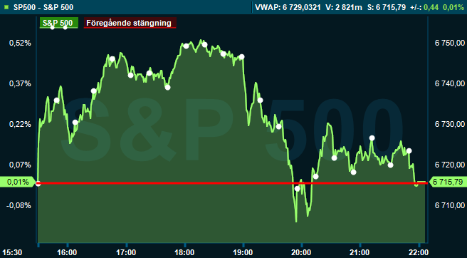 Vid börsstängning var breda S&P 500-indexet oförändrat vid nivån 6.715, och räknat från Stockholmsbörsens stängning hade indexet sjunkit 0,4 procent. Dow Jones industriindex steg 0,5 procent till 46.758, samtidigt som tekniktunga Nasdaq Composite försvagades med 0,3 procent till 22.780.