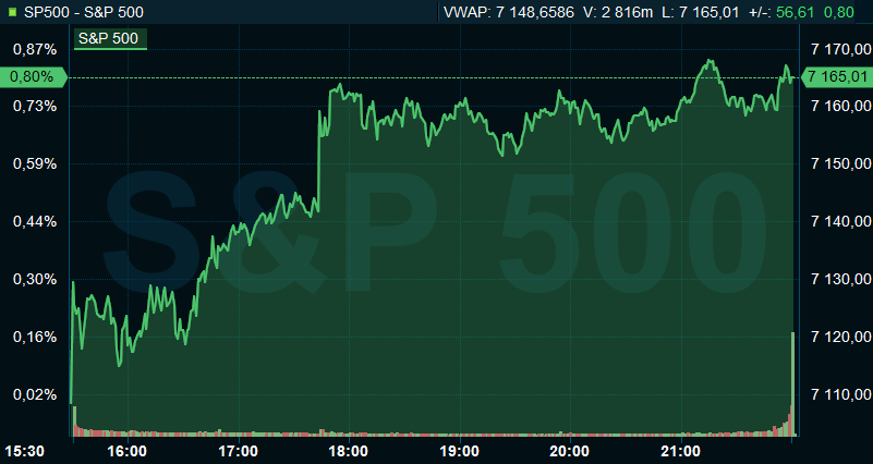 Vid stängning steg S&P 500 0,8 procent till 7.165, och räknat från Stockholmsbörsens stängning hade indexet stigit med 0,3 procent. Det tekniktunga Nasdaq compsite avancerade med 1,6 procent till 24.836. Dow Jones industriindex gick mot strömmen och sjönk med 0,2 procent till 49.229.