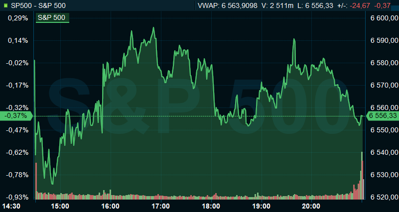Vid stängning var S&P 500 ned 0,4 procent till 6.556, och räknat från Stockholmsbörsens stängning hade indexet sjunkit med 0,4 procent. Dow Jones industriindex sjönk 0,2 procent till 46.123, medan Nasdaq Composite backade 0,8 procent till 21.761.