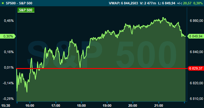 Vid börsstängning var breda S&P 500 upp 0,3 procent till 6.850, och räknat från Stockholmsbörsens stängning hade indexet stigit med 0,2 procent. Dow Jones industriindex steg 0,9 procent till 47.882 medan det tekniktunga Nasdaq Composite avancerade med 0,2 procent till 23.454.