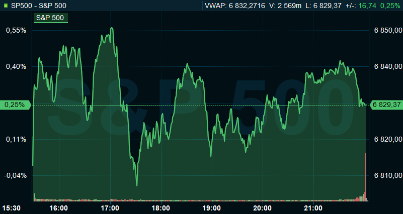 Vid börsstängning var breda S&P 500 upp 0,3 procent till 6.829, och räknat från Stockholmsbörsens stängning hade indexet stigit med 0,3 procent. Dow Jones industriindex steg 0,4 procent till 47.474 medan det tekniktunga Nasdaq Composite försvagades med 0,6 procent till 23.413.