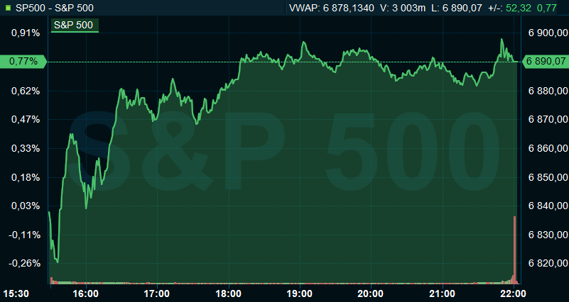 Vid stängning var S&P 500 upp 0,8 procent till 6.890, och räknat från Stockholmsbörsens stängning hade indexet stigit med 0,3 procent. Dow Jones industriindex steg 0,8 procent till 49.174, medan Nasdaq Composite avancerade med 1,0 procent till 22.863.