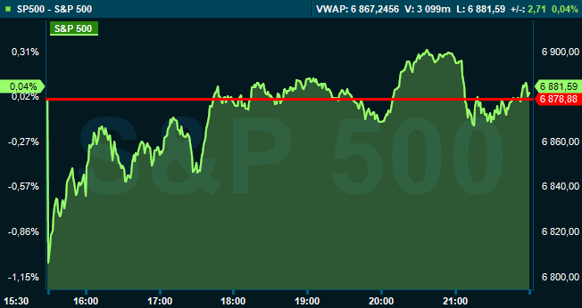 Vid stängning var S&P 500 oförändrad vid 6.881, och räknat från Stockholmsbörsens stängning hade indexet stigit med 0,5 procent. Dow Jones industriindex sjönk 0,2 procent till 48.904 och Nasdaq Composite avancerade med 0,4 procent till 22.748.