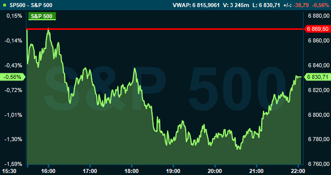Vid stängning var S&P 500 ned 0,6 procent till 6.830, och räknat från Stockholmsbörsens stängning hade indexet stigit med 0,3 procent. Dow Jones industriindex sjönk 1,6 procent till 47.953 och Nasdaq Composite tappade 0,3 procent till 22.748.