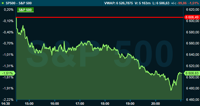 Vid stängning var S&P 500 ned 1,5 procent till 6.506, och räknat från Stockholmsbörsens stängning hade indexet sjunkit med 0,8 procent. Dow Jones industriindex backade med 1 procent till 45.577, medan Nasdaq Composite var ned 2,0 procent till 21.647.