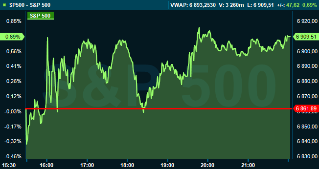 Vid stängning var S&P 500 upp 0,7 procent till 6.909, och räknat från Stockholmsbörsens stängning hade indexet stigit med 0,5 procent. Dow Jones industriindex steg 0,5 procent till 49.625 och Nasdaq Composite avancerade med 0,9 procent till 22.886.