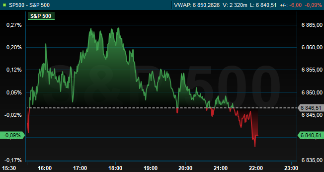 Vid stängning hade S&P 500 sjunkit 0,1 procent till 6.840, och räknat från Stockholmsbörsens stängning hade indexet sjunkit med 0,3 procent. Dow Jones industriindex var ned 0,4 procent till 47.561 och Nasdaq Composite hade stigit 0,1 procent till 23.576.