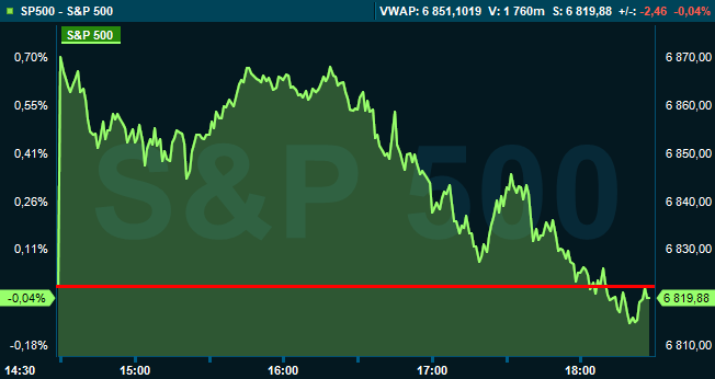 Vid 18.30-tiden var Dow Jones industriindex ned 0,3 procent till 47.392, medan breda S&P 500 var oförändrat vid nivån 6.819. Tekniktunga Nasdaq Composite steg 0,3 procent till 23.648.