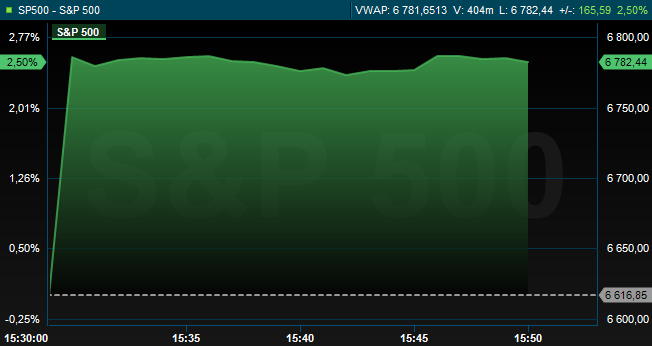 Omkring klockan 15.50 var S&P 500 upp 2,5 procent till 6.782. Dow Jones industriindex hade stigit 3 procent till 47.970 och tekniktunga Nasdaq kompositindex var upp 3,1 procent till 22.703.