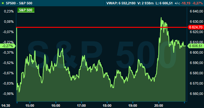 Vid stängning var S&P 500 ned 0,3 procent till 6.606, och räknat från Stockholmsbörsens stängning hade indexet stigit med 0,3 procent. Dow Jones industriindex backade med 0,4 procent till 46.022, medan Nasdaq Composite var ned 0,3 procent till 22.090.